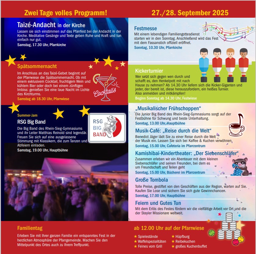 Unterstützen Sie uns mit vielen tollen Preise und tun Sie zugleich etwas Gutes. Denn mit dem Erlös des Festes fördern wir die Arbeit vor Ort und die der Steyler Missionare weltweit.